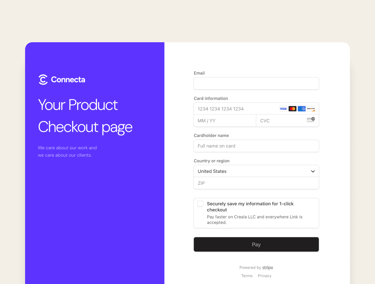 Give your customers a checkout that feels 100% yours, with your logo, colors, and messaging